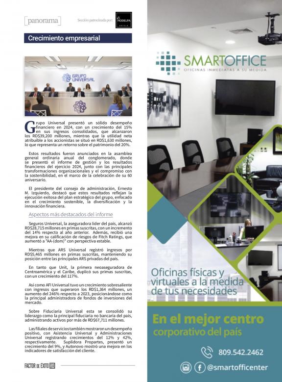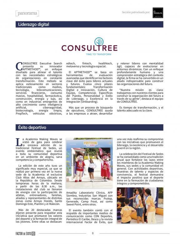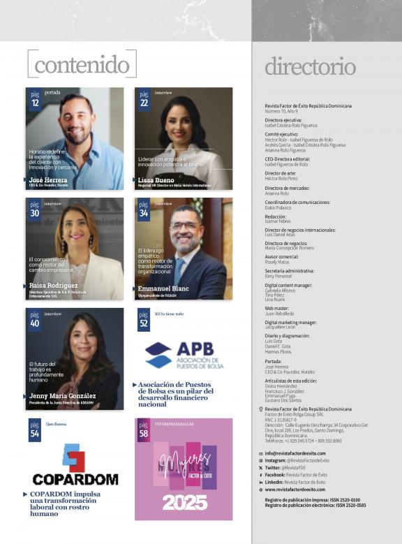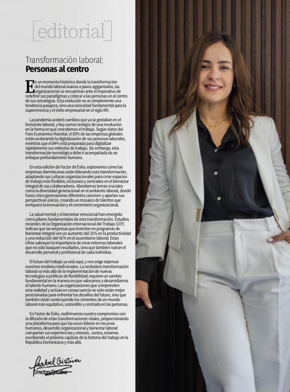FACTOR DE ÉXITO es una revista de circulación bimestral y plataforma digital que ocupa un espacio relevante en la cobertura de los temas gerenciales y de negocios en República Dominicana, esto, apuntada al liderazgo empresarial, las mejores prácticas de negocio, las realidades de los diversos sectores económicos y las tendencias gerenciales y de mejoramiento profesional que contribuyan a elevar la calidad de la gestión empresarial.